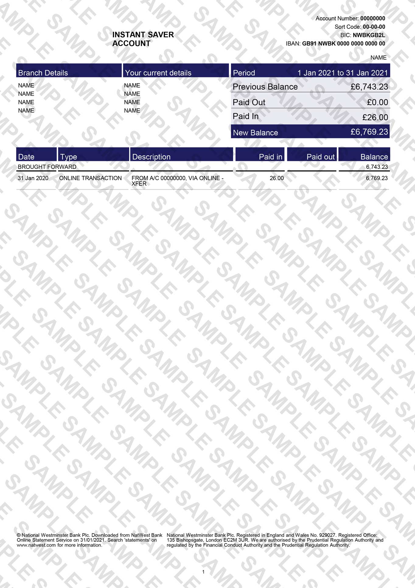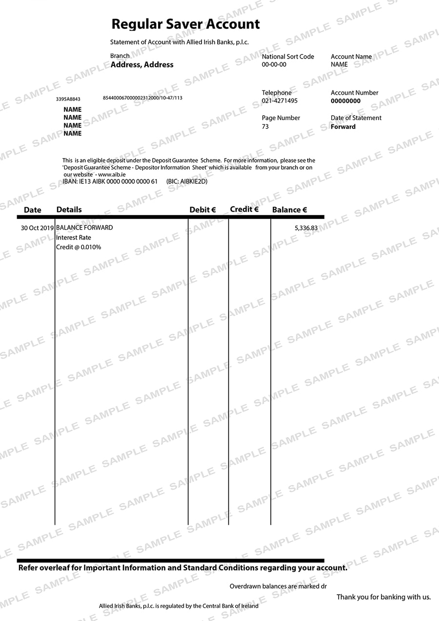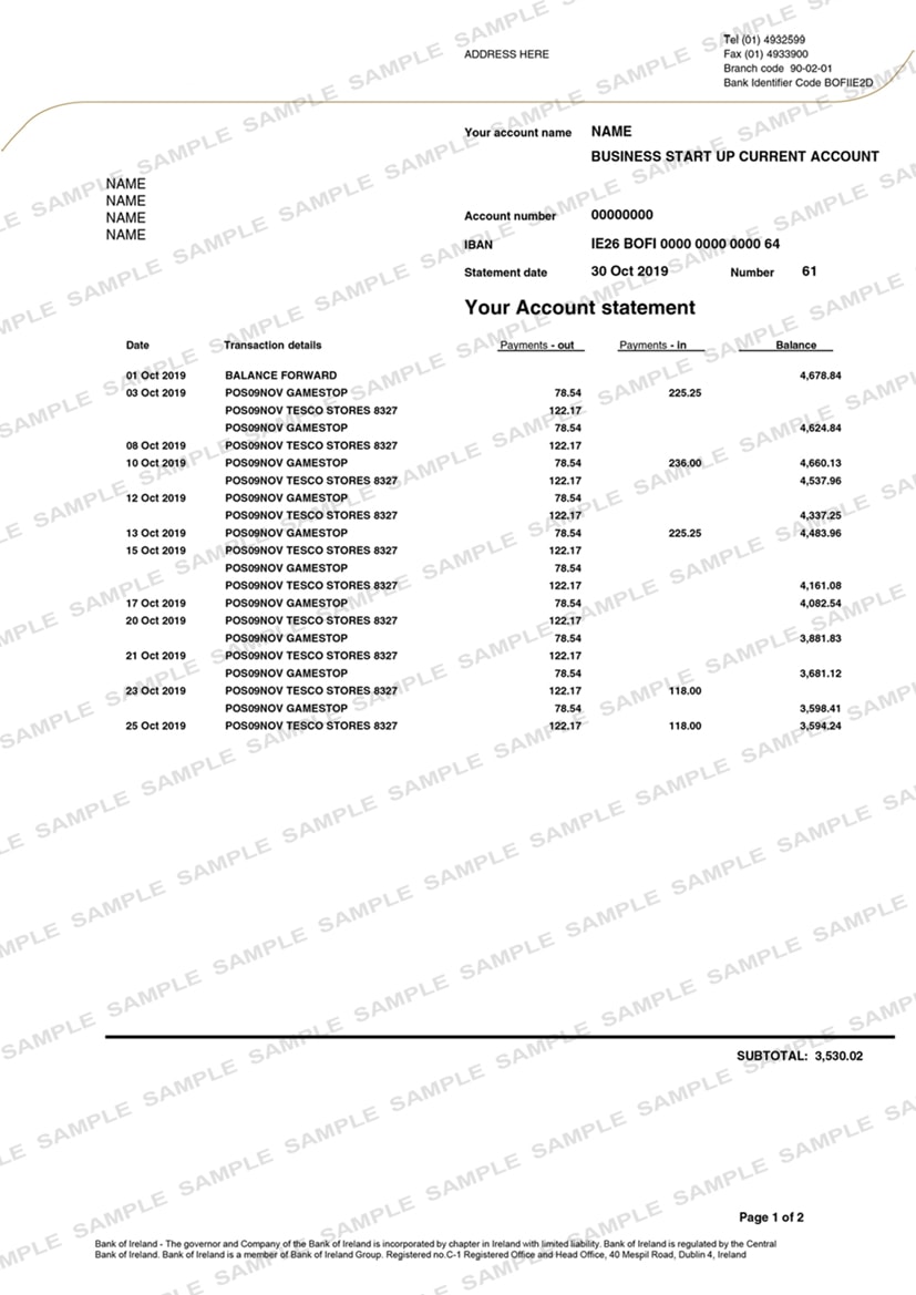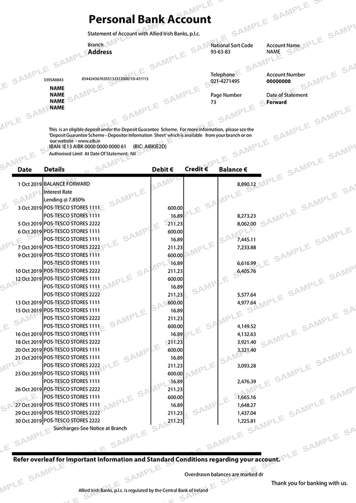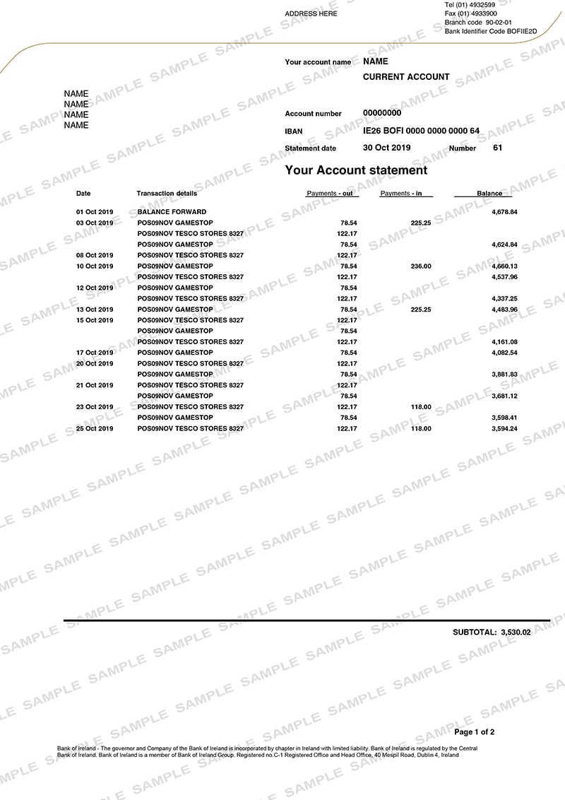 • We currently only have 2019 versions of Irish bank statements. If you need a 2019 version, please contact us. Or if you require an updated 2020 version, you may send images of your own bank statement and we will create it free of charge.